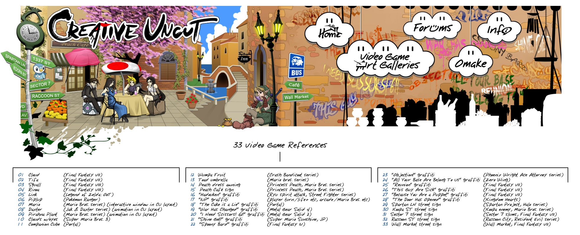 Barely a year after redesigning CU, I again had ideas for a new look. The aim was to further distinguish the site as a creative source for gaming concept artworks and design by updating to a 100% hand-drawn layout and a new logo to compliment it. Thirty-three gaming references are tied into the town illustration, can you find them all? See the full-sized illustration (at twice the size) below for help.
